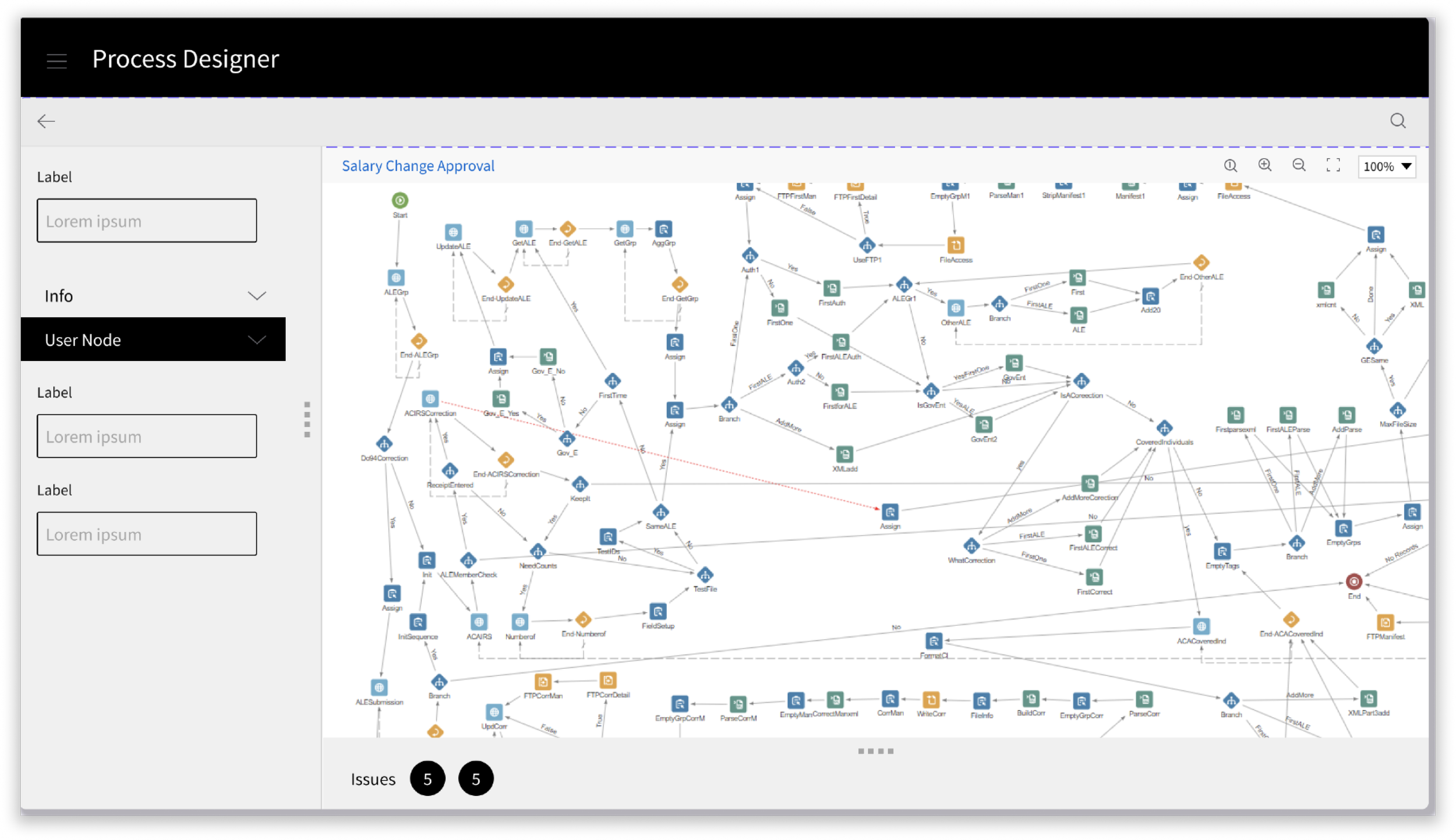 Our goal To enhance the user experience, I rearranged the process designer elements based on the research results: majority of users need node properties to configure nodes, design board to manage process flow, easy access to palette for search node types and secondary feature like debug mode, node activities and process issues to find errors. I emphasized on eliminating low usage features to focus user attention on managing and creating flows.